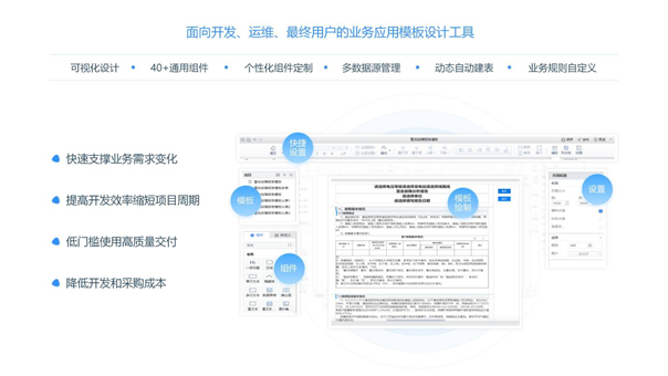 可视化设计:系统提供文本、表格、图表等40+种模板组件,用户基于可视化设计器,通过拖、拉、拽操作,以“搭积木”的形式,即可搭建出符合业务需求的模板;