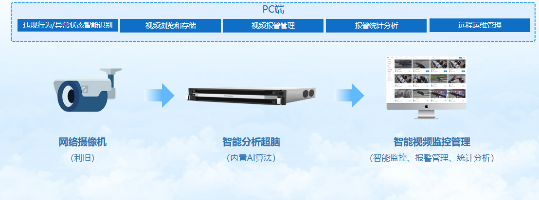 智能视频分析系统通过智能视频监控,实现对企业生产经营的全面智能感知,解决传统手段下信息获取不及时、预警不到位、人力成本过高等痛点。基于AI智能识别,自动实时监测企业生产过程中的人、物、行为等,能准确检测识别出异常事件并及时预警,可极大提升企业生产的风险防范水平、保障安全生产,实现安全生产少人、无人化、智能化监管。