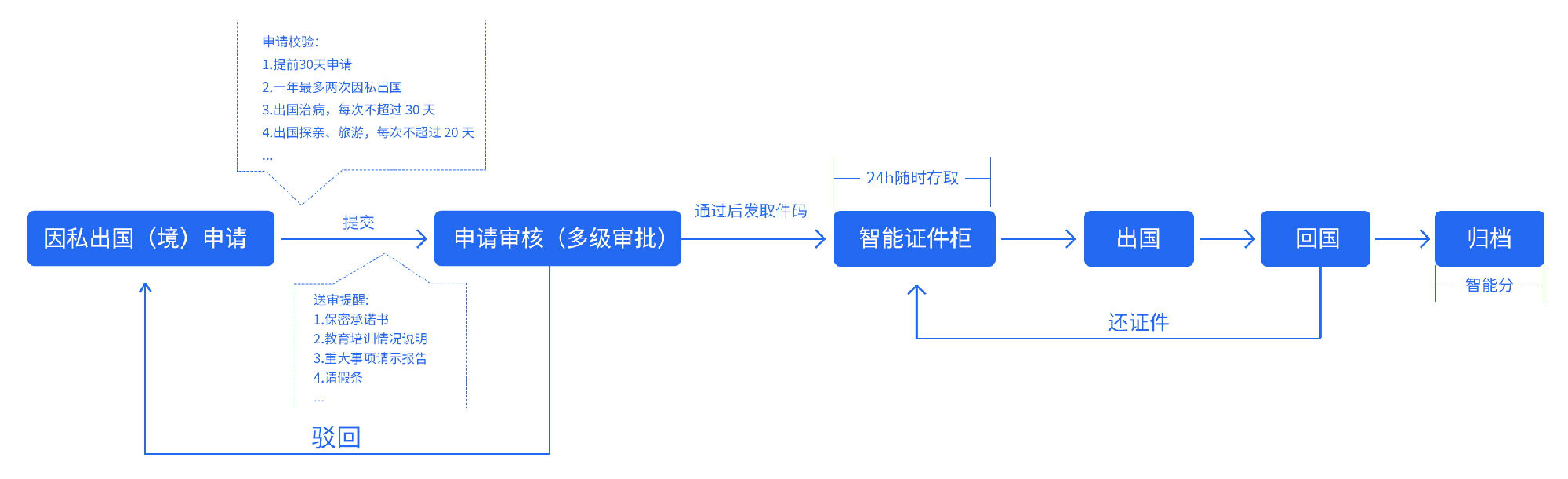 3、监督管理不便。申请材料注意事项多,人工审核易疏忽;干部人员数量多,出国(境)次数超标、未按时返回等情况难及时监督预警;证件资料多,借出返还、证件到期更换等工作,无法及时进行管理。