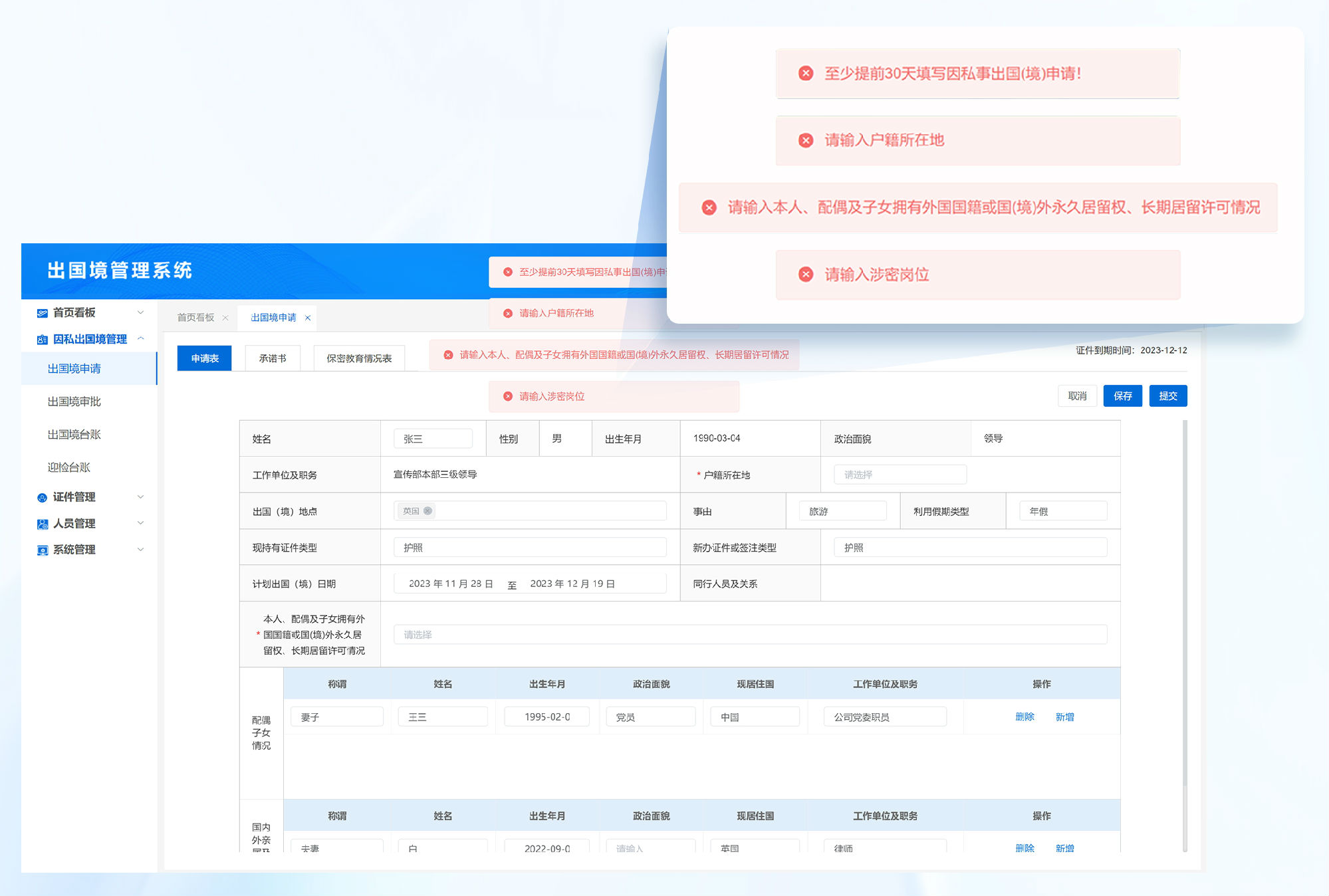 申请单提交时,系统会根据填写内容进行校验,若不符合校验规则,会自动提醒;如:需提前30天提交申请、一年最多2次因私出国、出国探亲和旅游不得超过20天等;同时,填写申请单后,系统会将“出国日期、返回日期、出国理由、出国人姓名”等信息自动同步至《出国承诺书》、《保密教育情况表》、《请示单》等送审材料中,实现一次填写,多表应用,规避多表填写信息不一致的情况发生,保障出国申请材料的合规性和完整性。