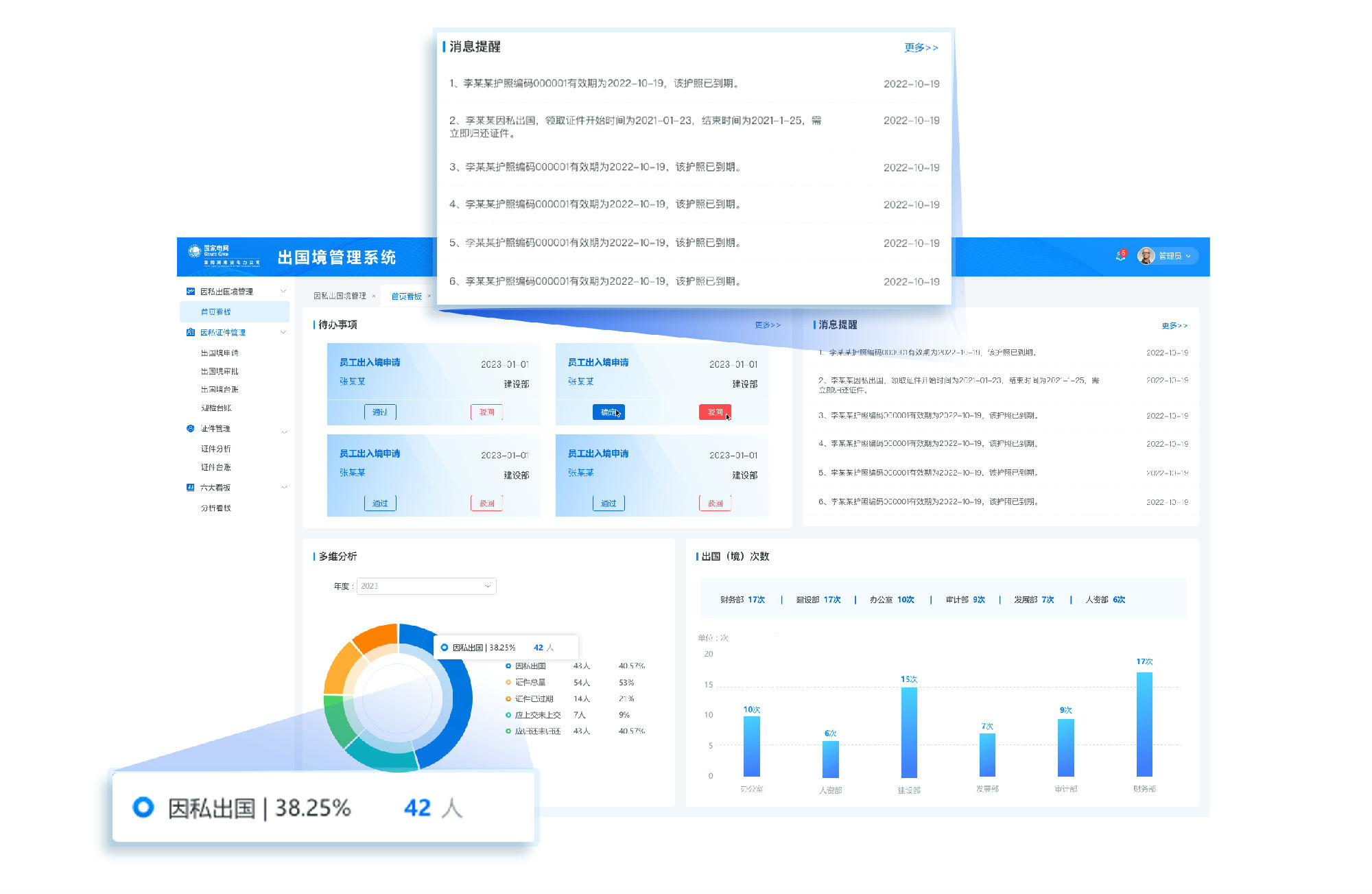 系统从证件借阅、归还情况、出国(境)次数、去往国家或地区等多维度进行全方位分析展示;并对证件到期、证件借出未还、逾期未归等异常情况进行预警提醒。