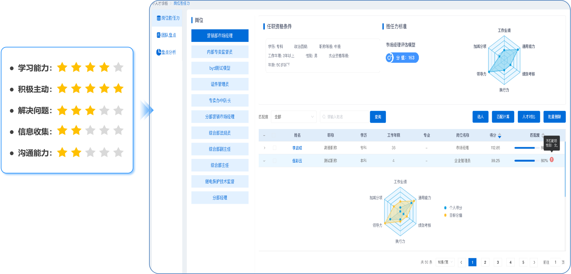 1.个人诊断。基于岗位任职资格条件、员工能力素质等相关信息,分析人员与岗位画像的匹配程度,以雷达图方式,清晰的展示员工的优势和短板。