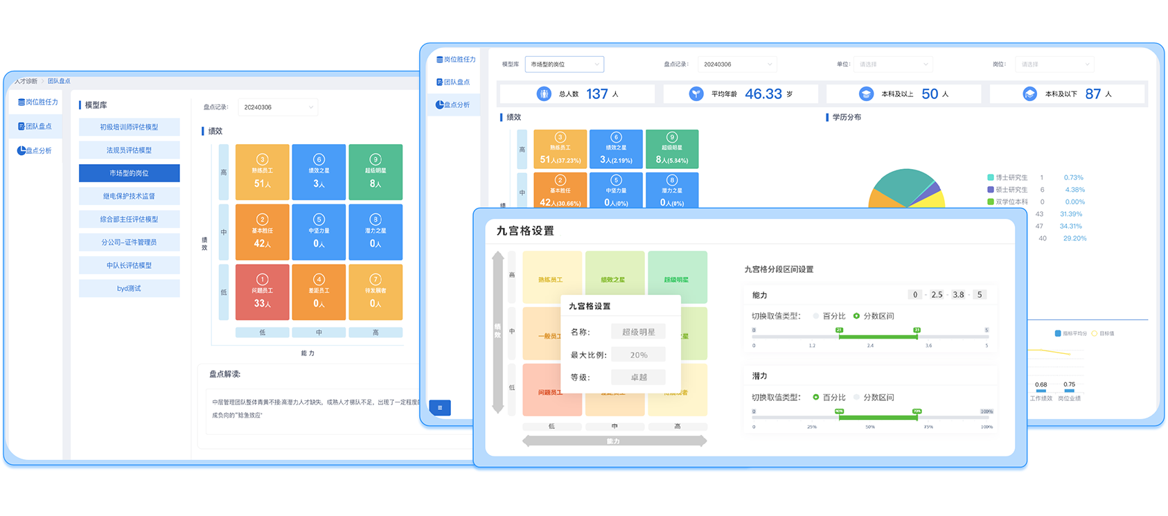 2.团队诊断。基于岗位胜任力模型,对团队整体进行盘点,以九宫格的形式分象限展示盘点结果,使企业的人才分布了如指掌,为梯队建设提供有力的工具化支持。