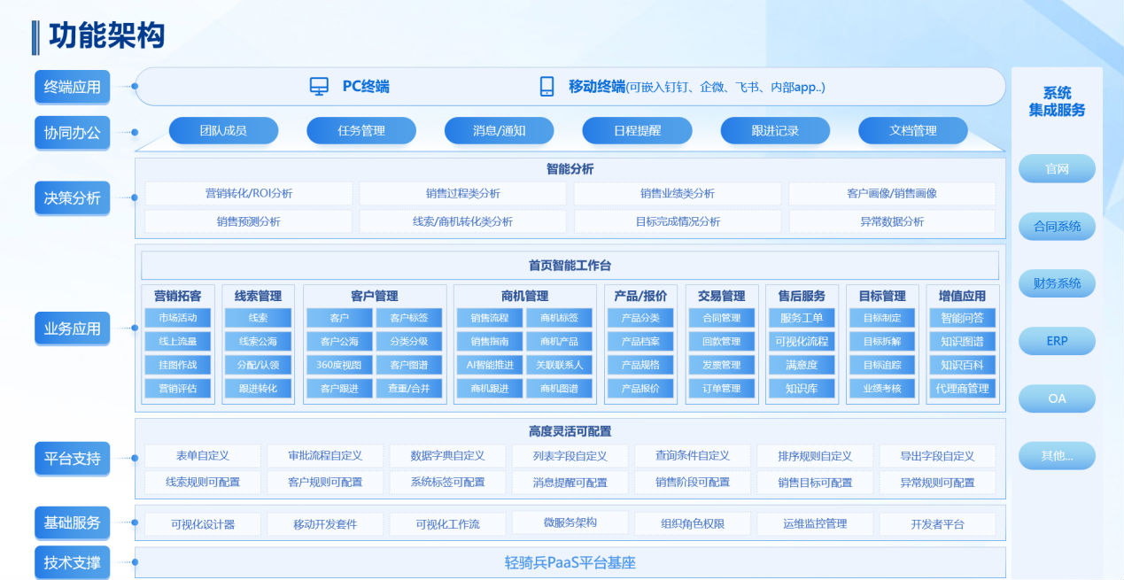 结合该企业业务流程,星空online(中国)CRM团队按照业界主流的“微服务、微应用”技术架构,利用低代码、移动应用等开发手段,为该企业定制打造了业务覆盖广、流程衔接顺畅、操作便捷的营销数字化星空web版登录入口。低代码的特性允许企业总部以及各分子公司以最高的效率实现对系统的维护和管理,助力其轻松应对不断变化的管理和业务场景。