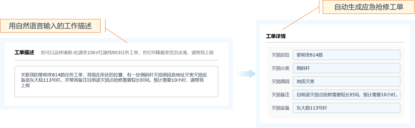 国网某省电力公司在电力应急灾害抢修管理中,借助于智能填写技术,实现了“用自然语言输入一段工单描述,大模型提取其中的工单信息,并自动填入到工单中”的功能。