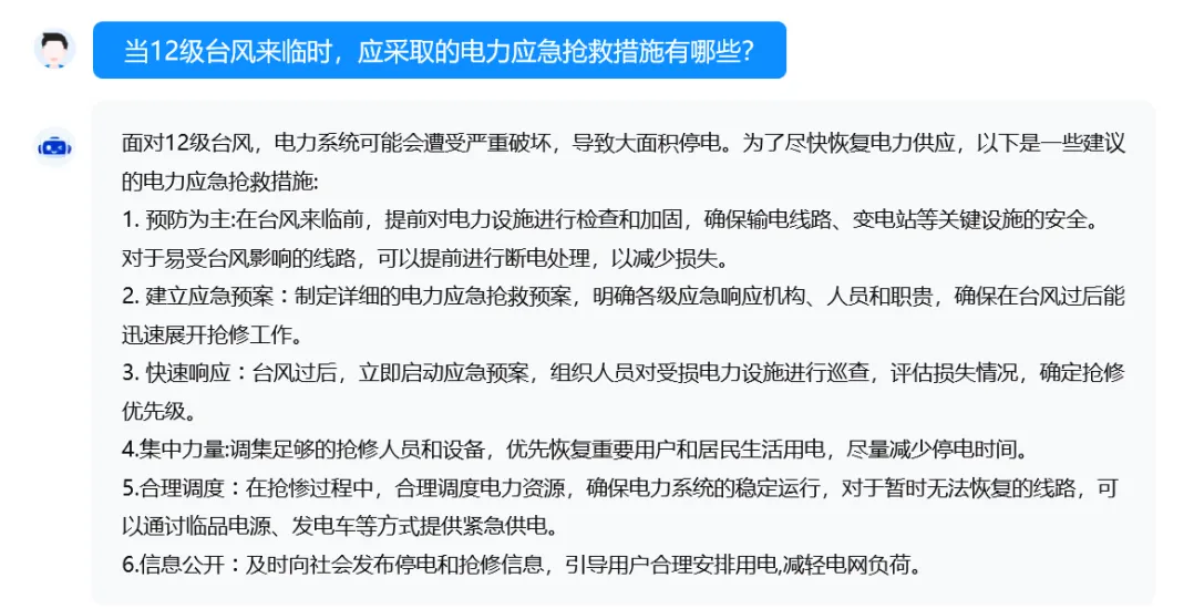 安全应急管理是电力企业生产运营的重中之重,面对海量法律法规、制度准则,工作人员往往难以准确掌握其中的细则要求。基于星空online(中国)打造的智能问答大模型,国网某省电力公司实现了应急管理系统的24小时“智能问诊”,工作人员在应急抢修过程中可随时对行业规范要求、突发事件处理方案等进行提问,系统可以给出准确答案以及答案来源,比如“面对12级台风,应该采取哪些应急抢修措施?”等。