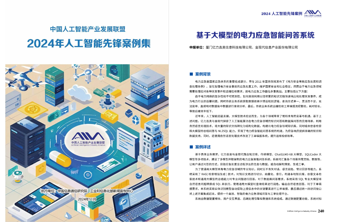 近日,中国人工智能产业发展联盟《2024年人工智能先锋案例集》(以下简称“案例集”)在中国人工智能产业发展联盟第十三次全体会议上正式发布,中国人工智能产业发展联盟副秘书长、中国信息通信研究院副总工程师王爱华,工业和信息化部新闻宣传中心副总编辑王兵共同上台见证。星空online(中国)联合亿力吉奥申报的“基于大模型的电力应急智能问答系统”成功入选新型工业化类案例。