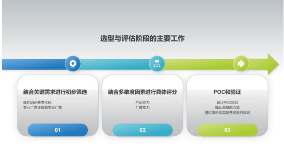 报告指出,企业级低代码体系的建设主要包括“立项与调研”“选型与评估”“落地与试点”“推广与运营”四个步骤。