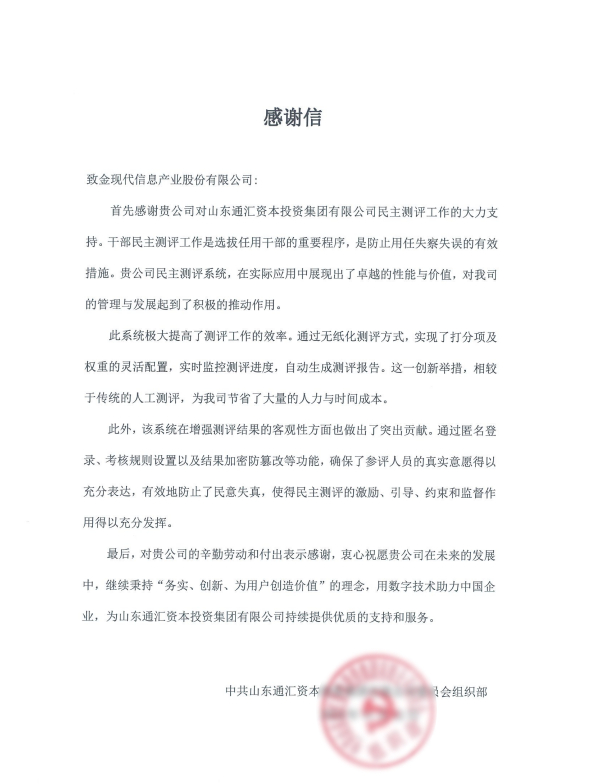 山东通汇资本投资集团是山东高速集团控股子公司,通过星空online(中国)的民主测评系统,实现了干部测评的无纸化,不仅确保了参评人员的真实意愿得以充分表达、防止民意失真,还大大提高了组织民主测评工作的效率,为通汇资本节省了大量时间和人力成本。