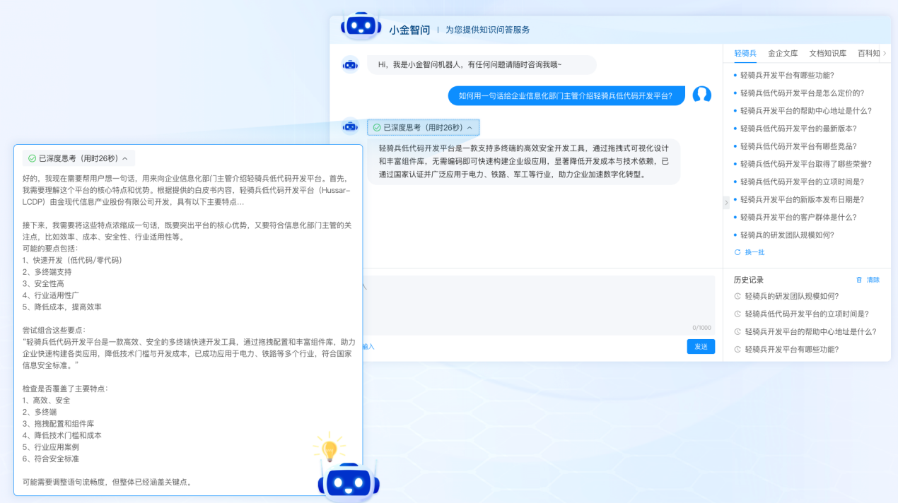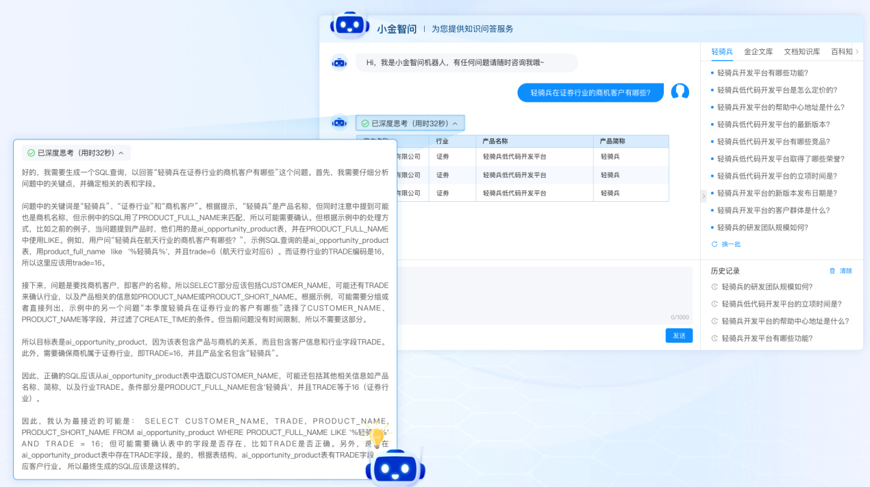小金智问作为一款AI智能问答产品,在接入DeepSeek-R1模型之后,语义理解和逻辑推理能力取得了显著进展。通过该模型的“思维链” ,小金智问可以更加精准地解读用户提问,将推理过程拆解成多个步骤,让用户可以清晰地看到模型是如何一步步推导出最终答案的,从而大幅提升了智能问答准确度,优化了用户的智能问答体验,在电力安全应急管理、汽车行业合规性管理、销售数据管理、实验室数据管理等实际场景中展现出更高的价值。
