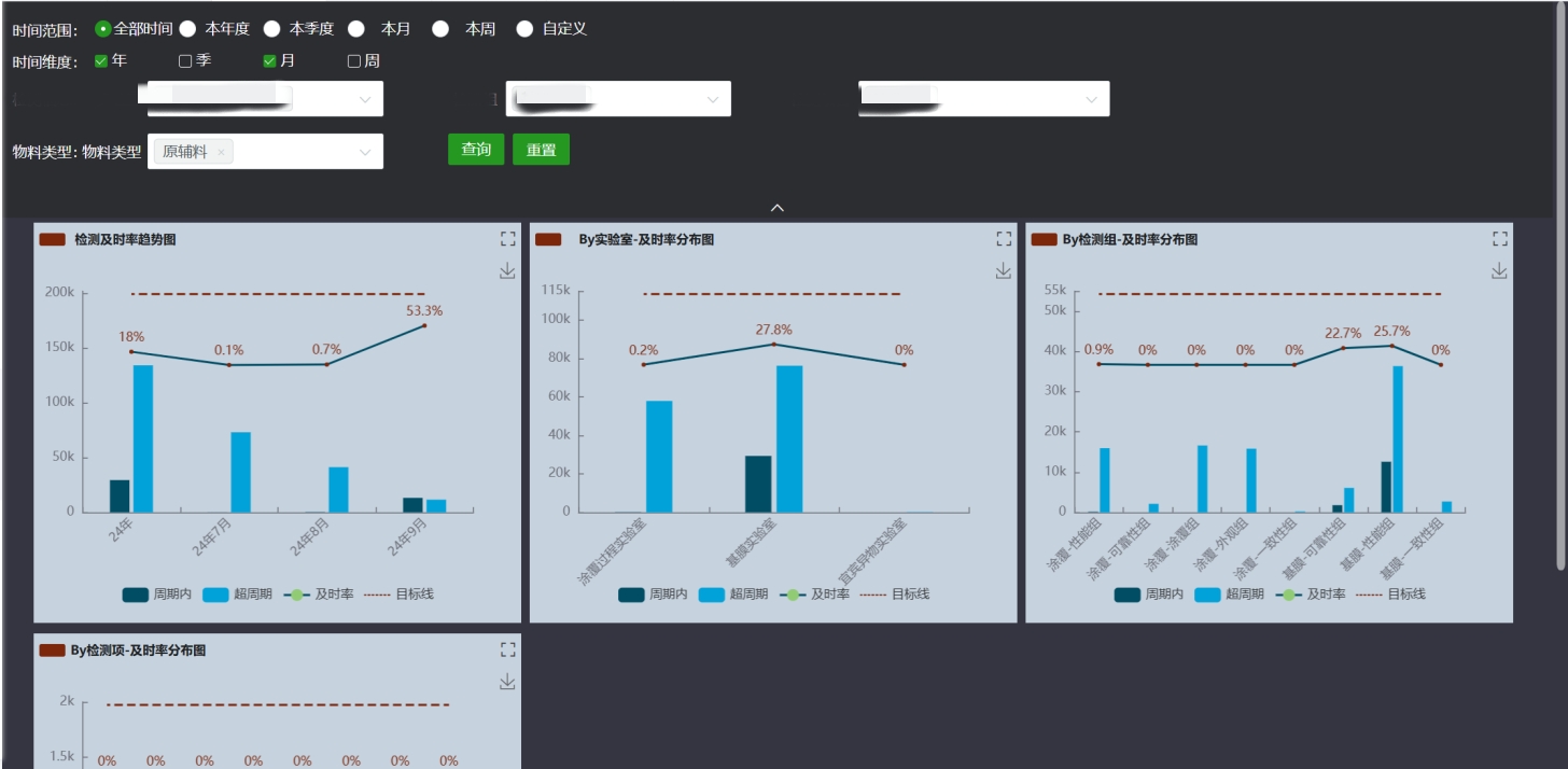 为确保产品质量,中材锂膜建立了从生产到成品的全流程检测体系:不仅要在生产完成后检测成品质量,还要在生产过程中实时监测各项指标。而检测的及时性是保证结果准确的前提。从样品接收到所有检测项目完全提交,星空online(中国)LIMS对实验室检测进行全流程管理,根据不同需求进行分类管理,实时追踪检测进度,并直观展示各基地的检测项目及时率数据,方便快速定位延误环节,对不及时的项目进行重点关注和把控。