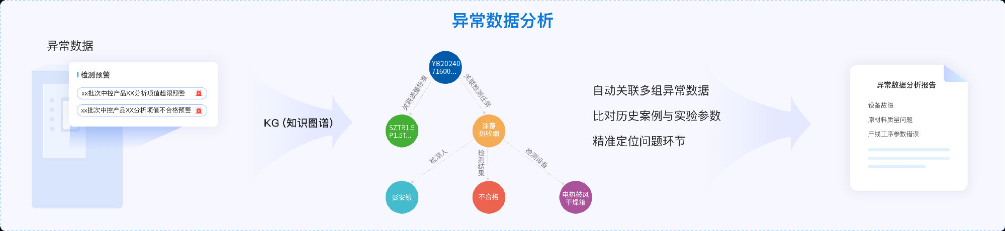 知识图谱溯源:基于AI知识图谱技术,系统自动关联多组异常数据,比对历史案例与实验参数,精准定位问题环节(如设备故障或操作疏漏)。平均排查时间从3天缩短至2小时。某电子器件企业借此减少产线停机损失超百万元。