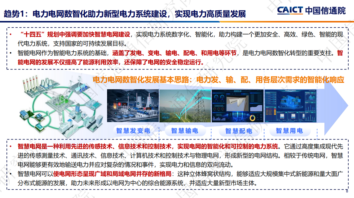会上,中国信通院云大所政企数字化转型部副主任董恩然指出,能源行业数智化转型的趋势之一是以电力电网数智化助力新型电力系统建设,实现电力高质量发展。而电力电网数智化发展基本思路则是电力发、输、配、用各层次需求的智能化响应。