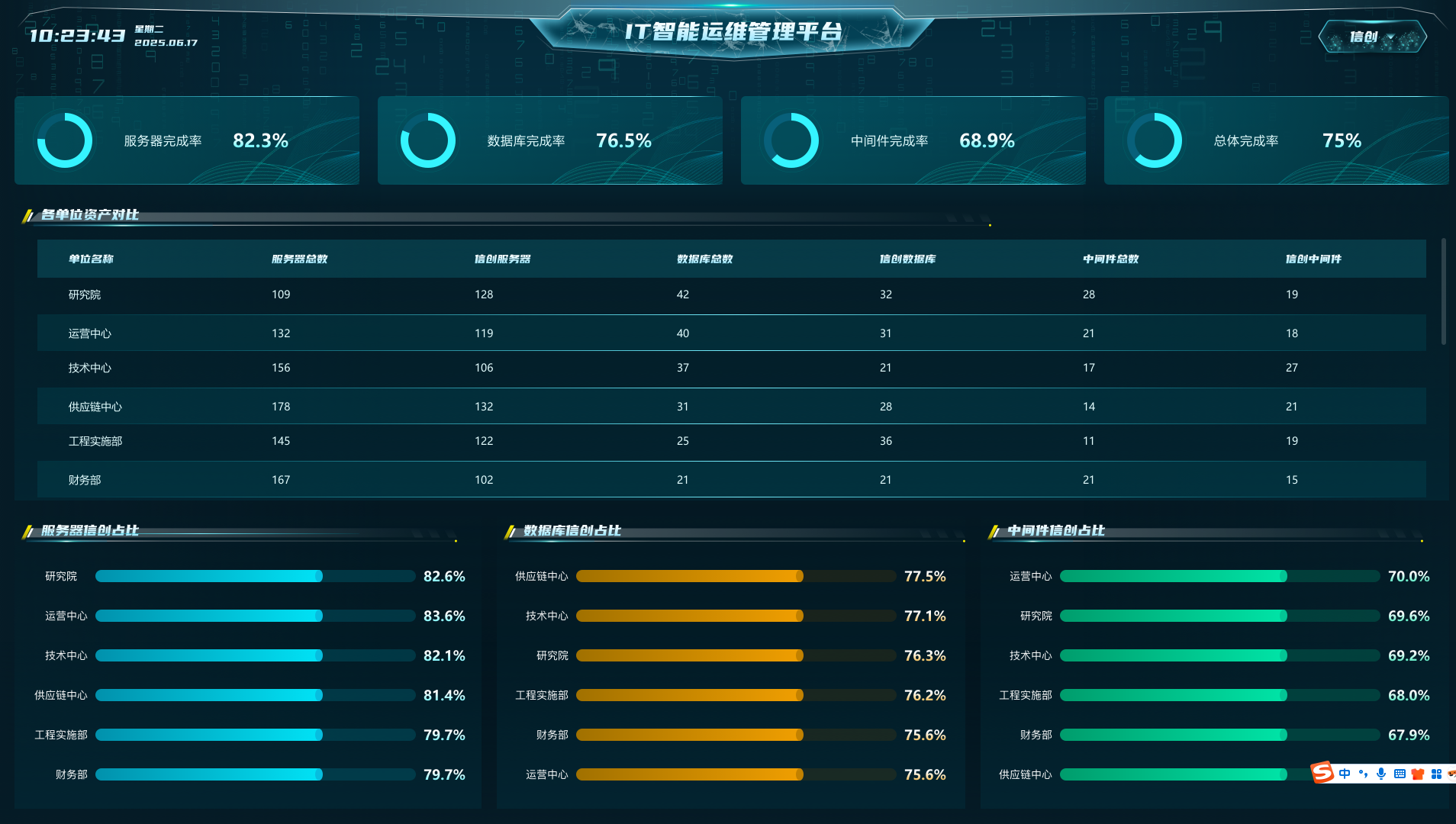 配备动态进度看板,通过可视化图表实时展示信创资产占比、替换完成度等指标,为信创替代策略制定与成果汇报提供数据支撑,助力企业高效推进信创替代进程。
