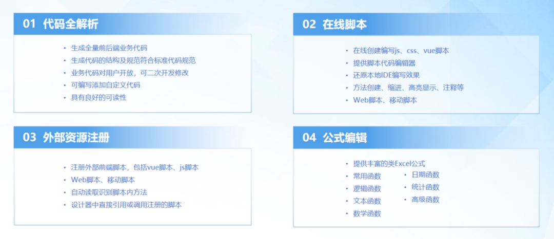 采用 “零 - 低 - 高” 分层开发模式:简单的表单流程用零代码快速搭建;80% 的常规业务场景用低代码覆盖;剩下20%的复杂逻辑通过开放全量代码生成、在线脚本注册等能力突破边界,做到 “门槛低但上限高”。