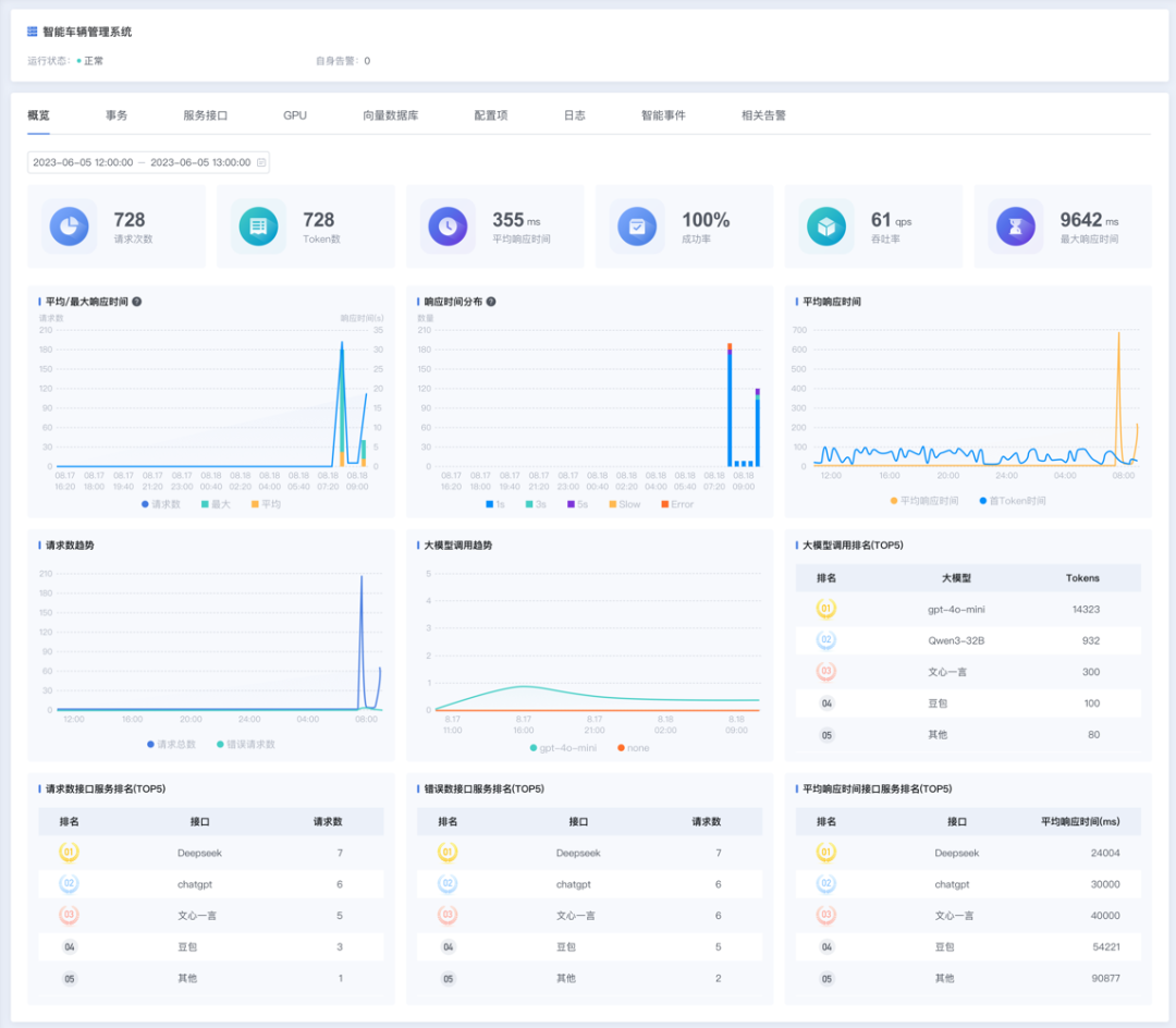 如今许多单位加速推进AI中台建设,大模型服务已成为支撑各智能应用运转的“核心枢纽”,其运行状态直接关系业务连续性——一旦模型服务出现异常,极易引发连锁故障,星空web版登录入口支持主动对模型接口服务进行拨测,接口不可用或性能异常情况及时告警,为模型服务的稳定运行加上“双保险”。
